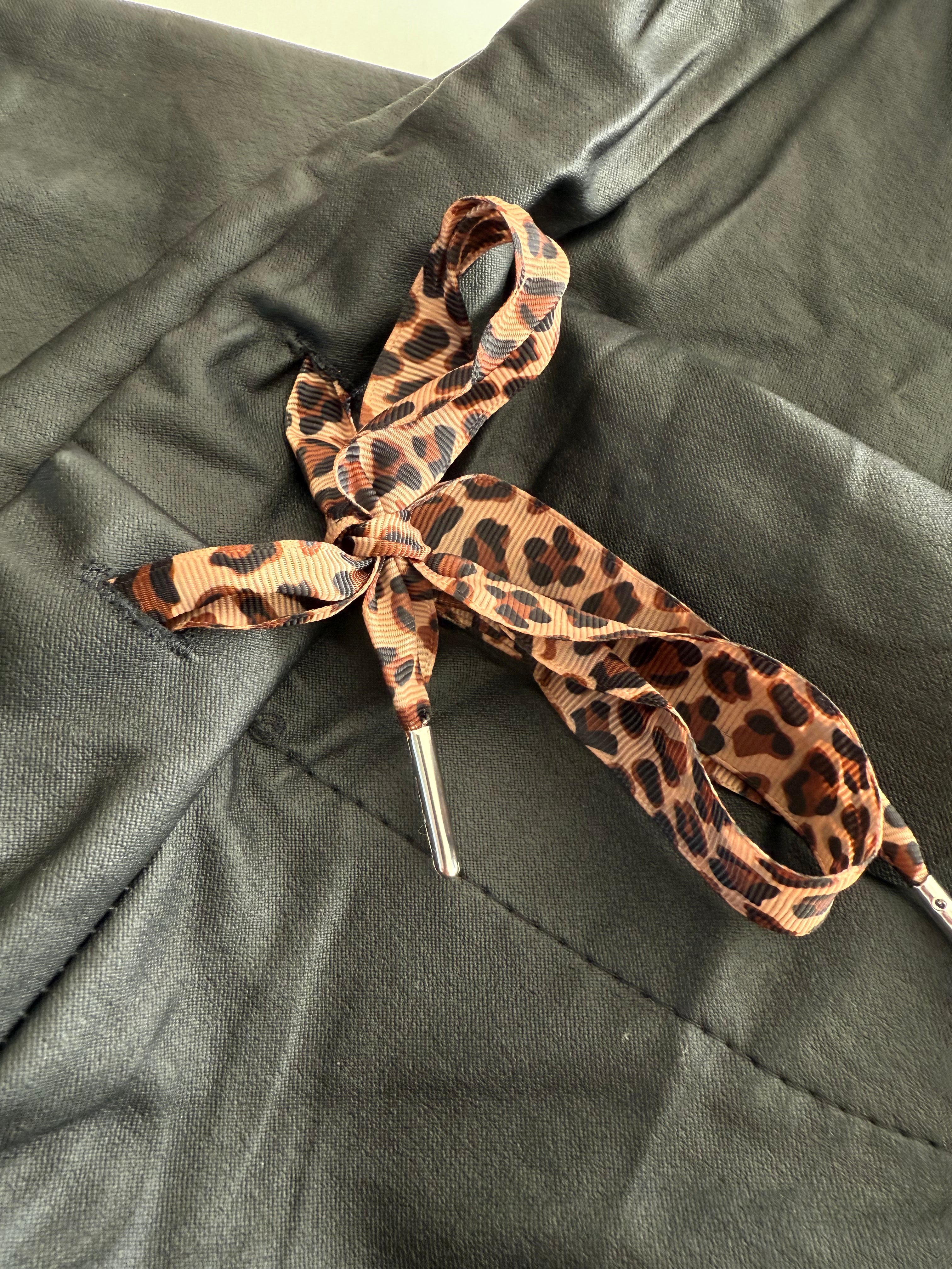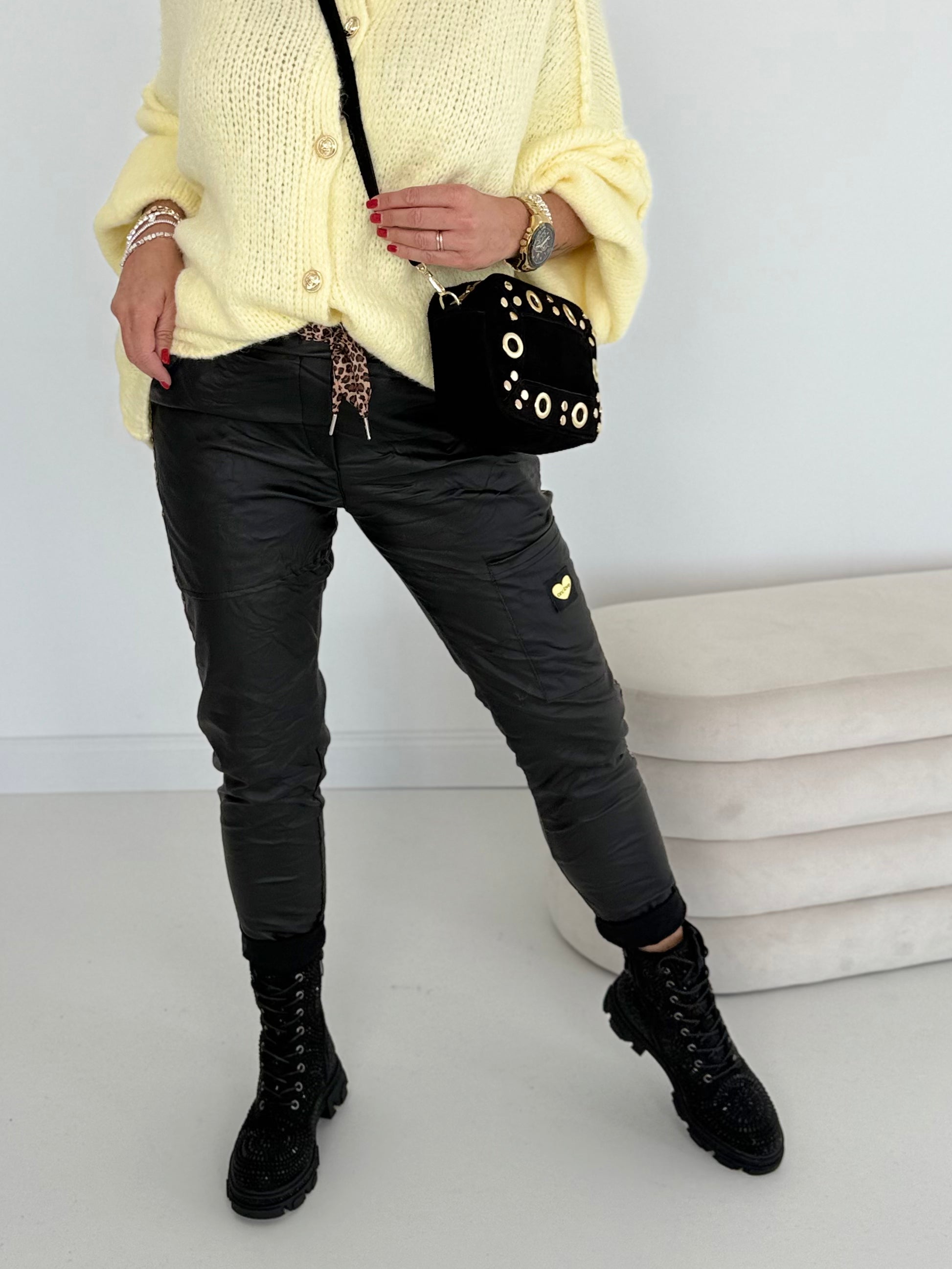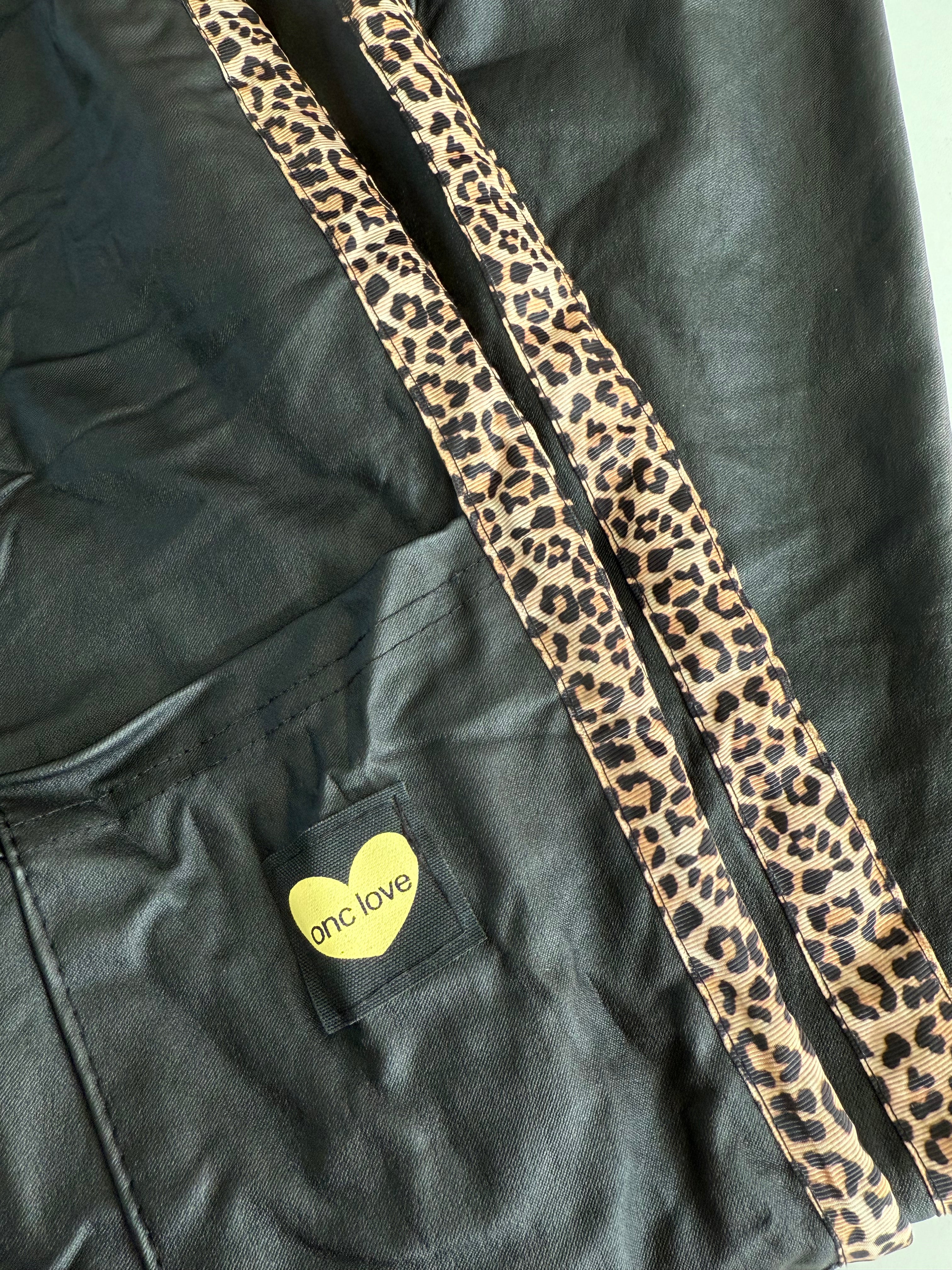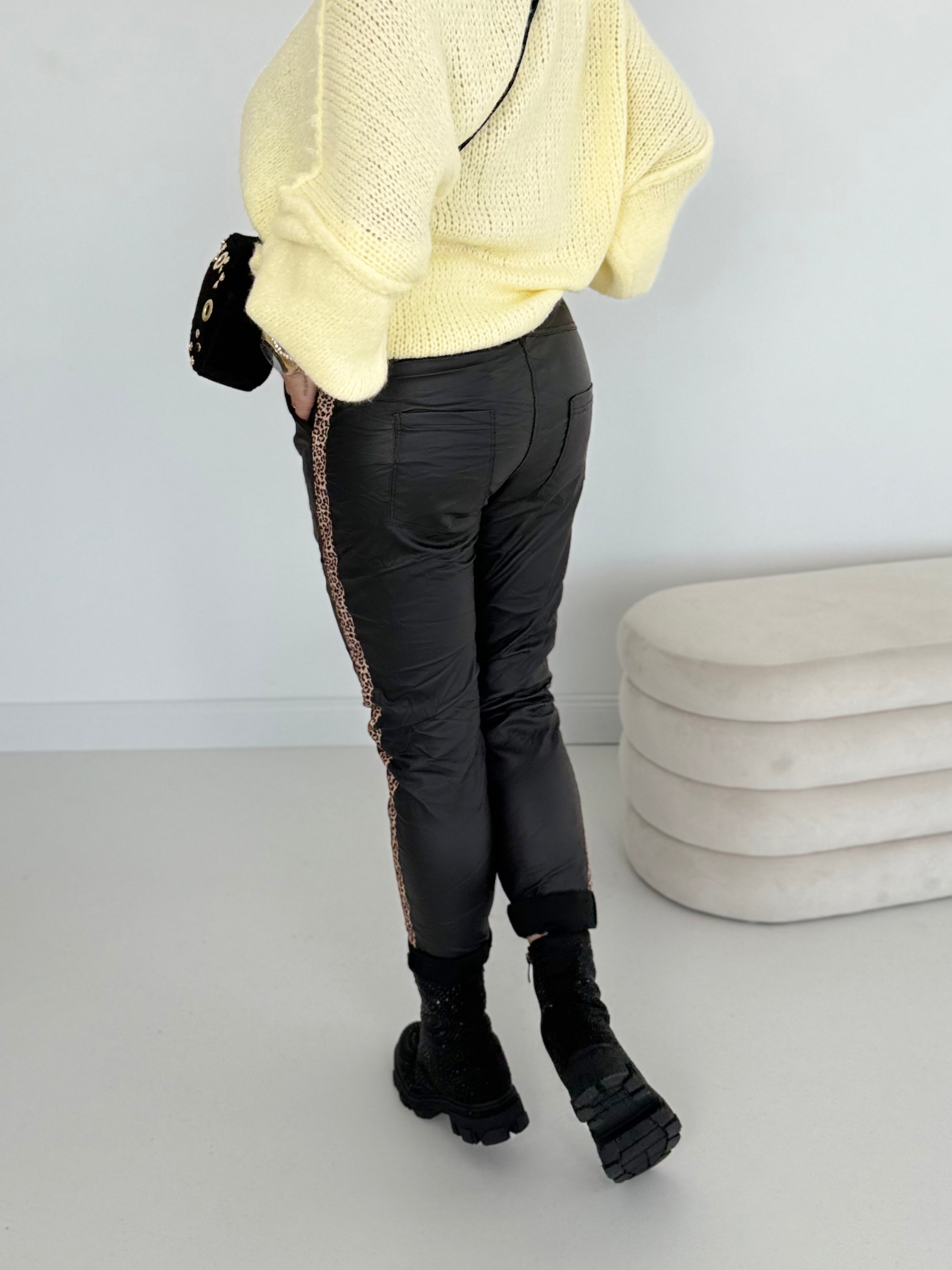 Ich liebe diese sehr bequeme schwarze, vegane Stretch Lederhose, die an der rechten und linken Seite mit den angesagten Leostreifen verziert ist.